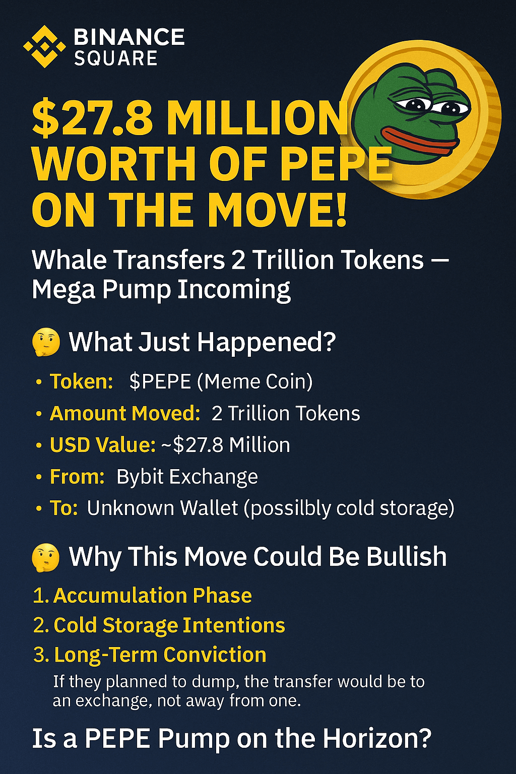 🧠 Cosa è appena successo? Token: $PEPE (Meme Coin) Quantità: 2 Trillion Token Valore: ~$27,8 milioni Da: Exchange Bybit A: Wallet sconosciuto (possibilmente cold storage) Tali enormi trasferimenti fuori exchange spesso segnalano accumulo o posizionamento strategico. Quando le balene si muovono in queste dimensioni, raramente è senza motivo.