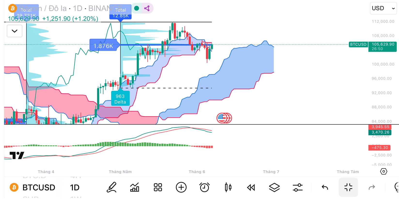 BTCUSD sta reagendo a una forte zona di supporto tecnico intorno a 105K – è l'incrocio tra il fondo della nuvola Kumo, POC volume e il limite inferiore della zona laterale più vicina.