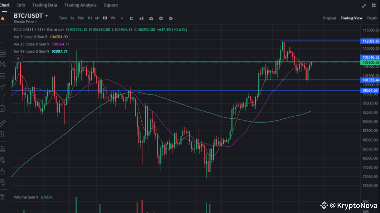 $BTC è appena rimbalzato dalla zona di supporto $101K–$103K ed ora sta testando la resistenza a $106K con crescente slancio. L'RSI sta salendo, e siamo sopra la MA25 — i tori si stanno scaldando. 🐂🔥