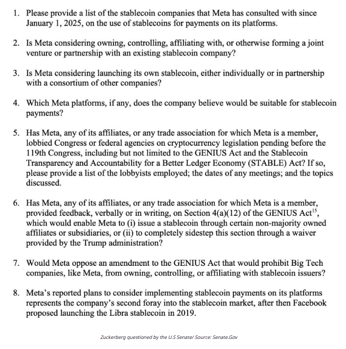 Zuckerberg ha ricevuto una scadenza di cinque giorni fino al 17 giugno per fornire risposte dettagliate a otto specifiche domande sulla strategia della stablecoin di Meta.