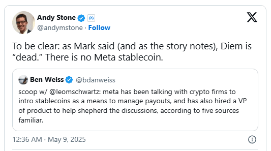 Il direttore della comunicazione di Meta, Andy Stone, ha risposto ai rapporti di maggio confermando che il progetto Diem è stato definitivamente interrotto, affermando che Diem è “morto” e che non c’era “nessuna stablecoin di Meta”.