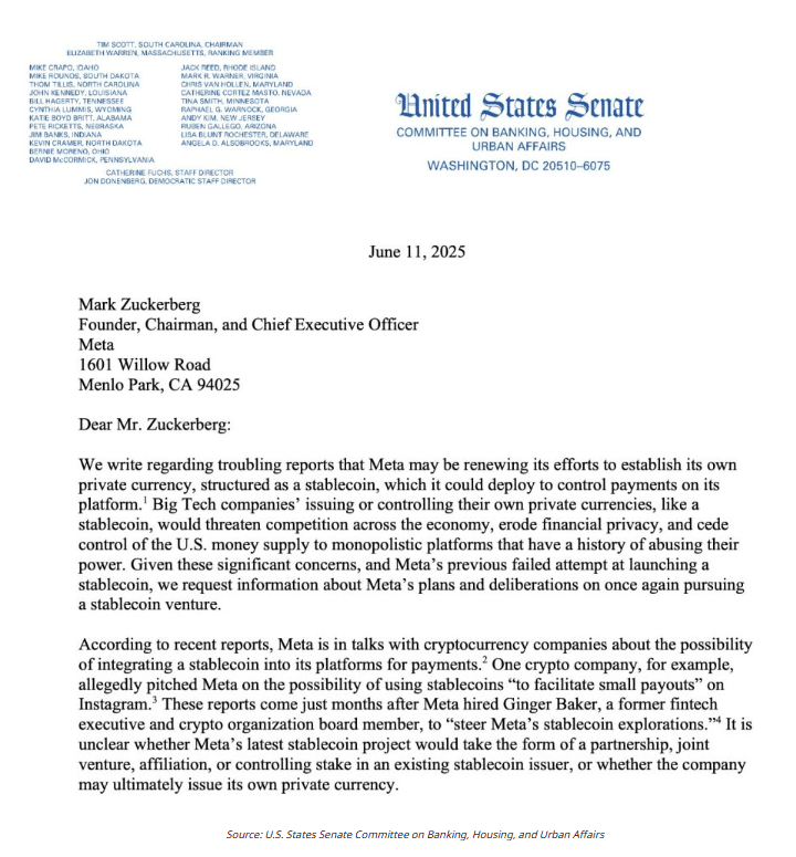 I senatori sono preoccupati che il presidente Donald Trump possa concedere alla società un'esenzione ai sensi del GENIUS Act, che potrebbe consentire a Meta di eludere le normative che altri emittenti di stablecoin devono seguire.
