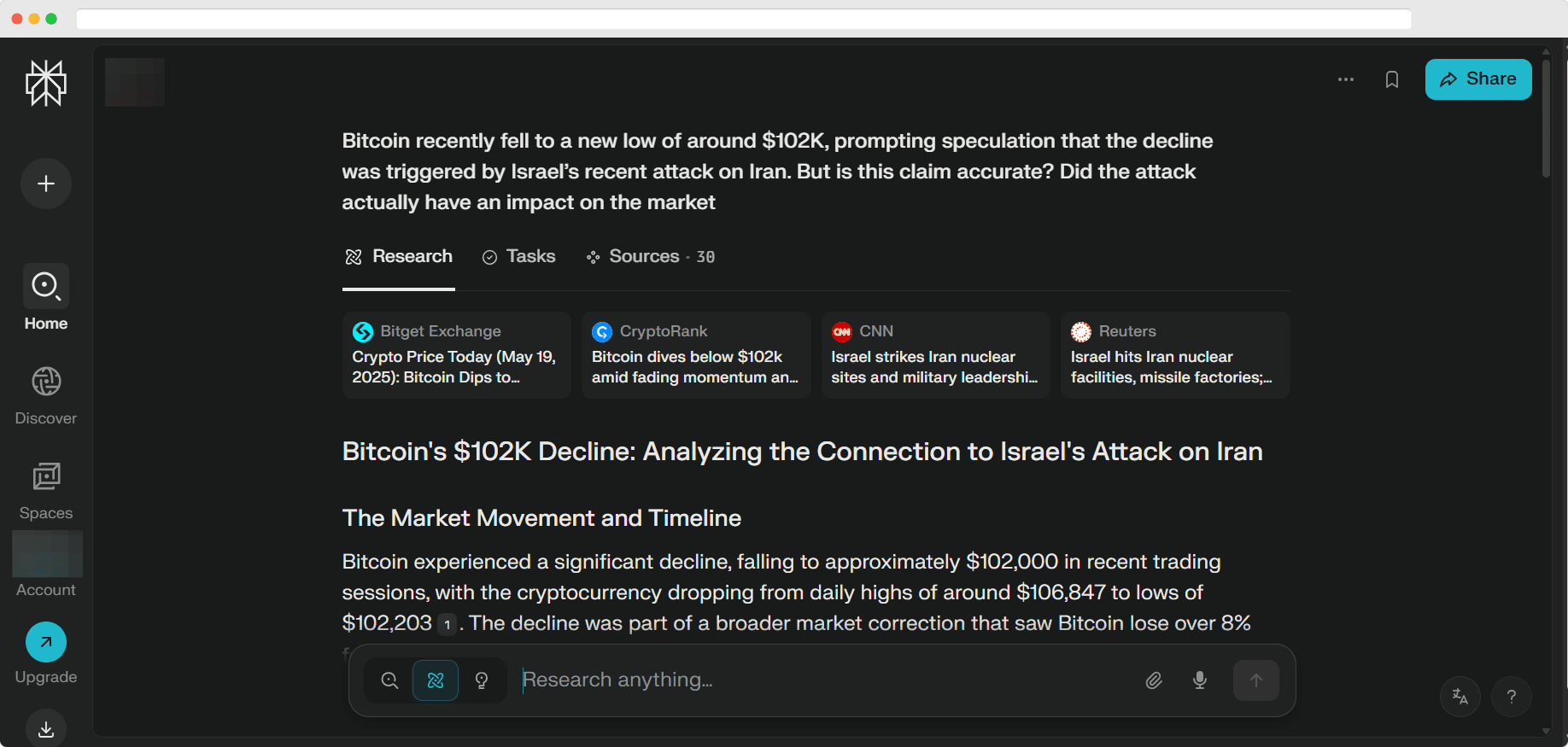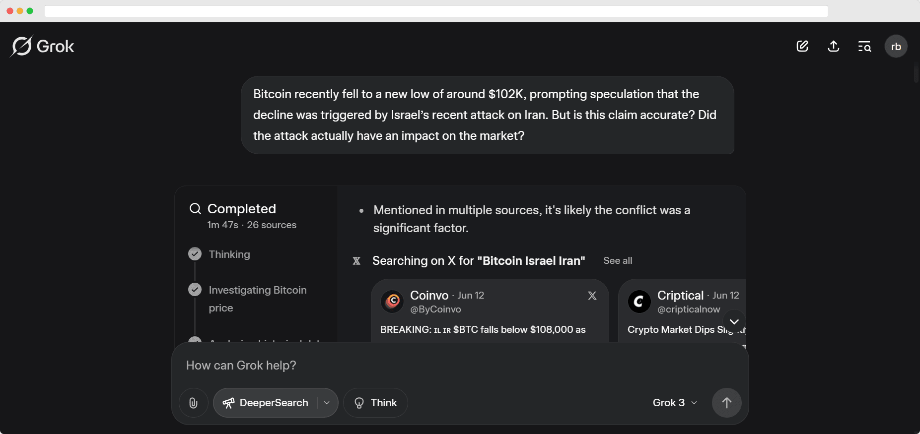 Hai visto quel recente #BTC calo a 102K dollari? Pensi che abbia davvero a che fare con l'attacco di Israele all'Iran? Ho utilizzato la funzione Deep Search su quattro diverse IA — ChatGPT, Grok, Jina AI e Perplexity AI. Ecco cosa ho trovato!