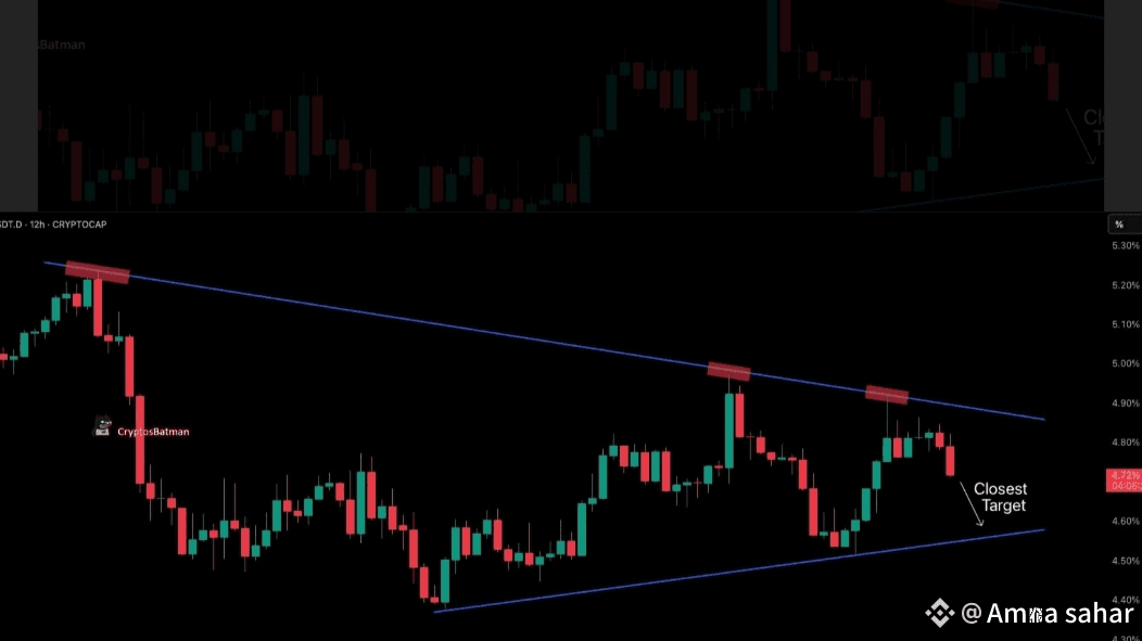 Quando $USDT.D scende, segnala che i trader stanno ruotando le stablecoin di nuovo verso gli asset crittografici, in particolare Bitcoin. Il rifiuto mostra che la fiducia sta tornando e i soldi stanno fluendo di nuovo nel mercato.