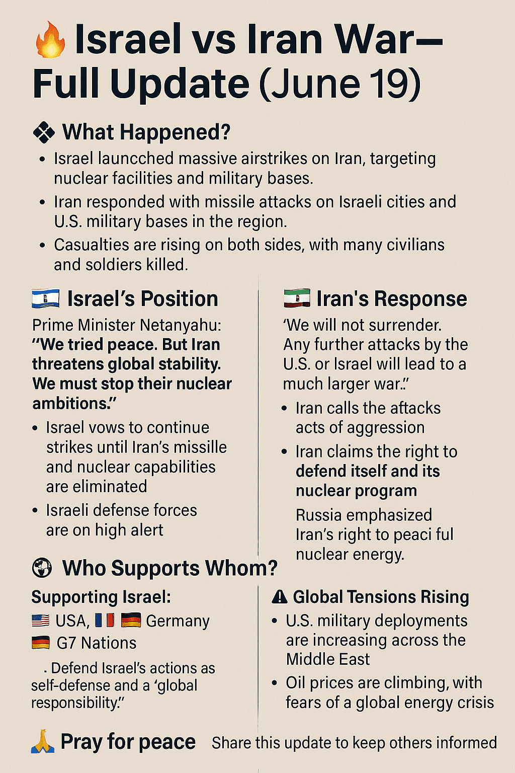 Israele ha lanciato massicci attacchi aerei contro l'Iran, prendendo di mira strutture nucleari e basi militari.