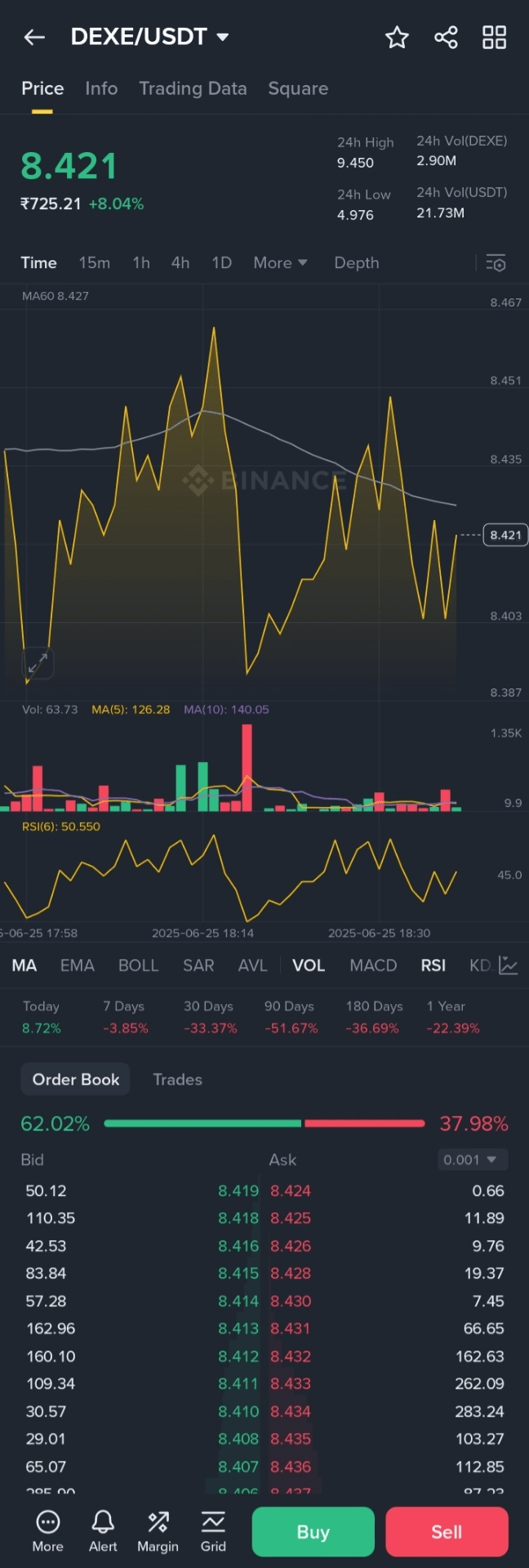 DEXE scambia intorno a $8.42, in aumento ~7.8% oggi, con fluttuazioni intraday tra $5.26–$9.12.