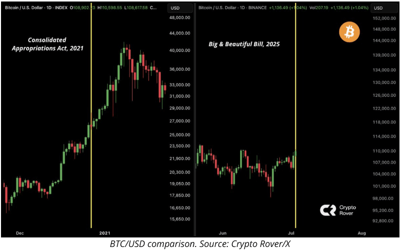 Come notato dai commentatori di crypto X, compreso l'account YouTube Crypto Rover, quando Trump ha firmato un progetto di legge di spesa per il COVID-19 alla fine del 2020, BTC/USD ha guadagnato successivamente il 38% in poche settimane.