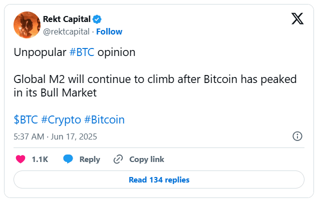 Questo mese, il trader e analista Rekt Capital ha riconosciuto che M2 può continuare a salire anche dopo che Bitcoin ha visto un picco di mercato rialzista.