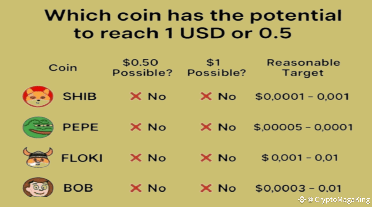 Sebbene $1 o $0.50 siano irrealistici a breve termine per la maggior parte delle meme coin, SHIB, PEPE, FLOKI e BOB potrebbero vedere forti rialzi se Bitcoin rimane rialzista e la stagione delle meme si riscalda.