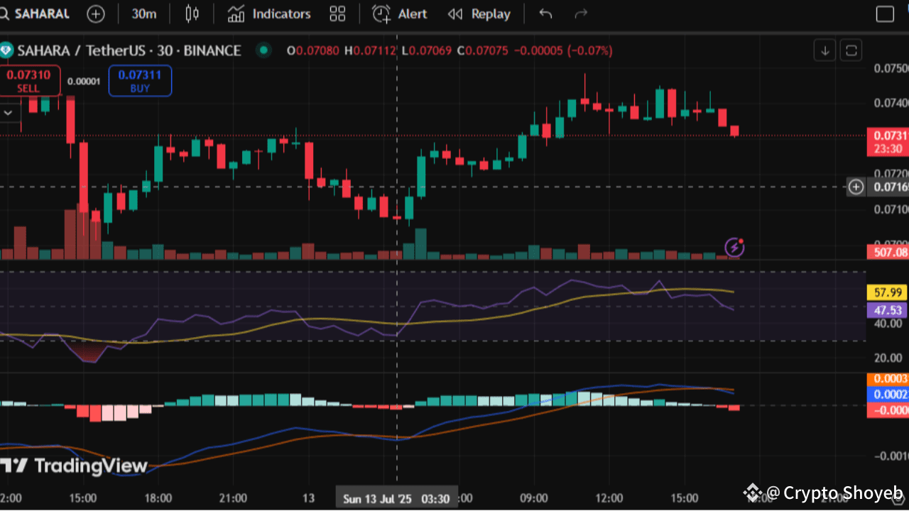 Vicino a 0.07430, #sahara ha incontrato un significativo rifiuto e, nonostante diversi tentativi, non è stato in grado di superare la resistenza. Con il prezzo che scende al di sotto della struttura importante a 0.07375, una candela engulfing ribassista ora convalida il controllo dei venditori.