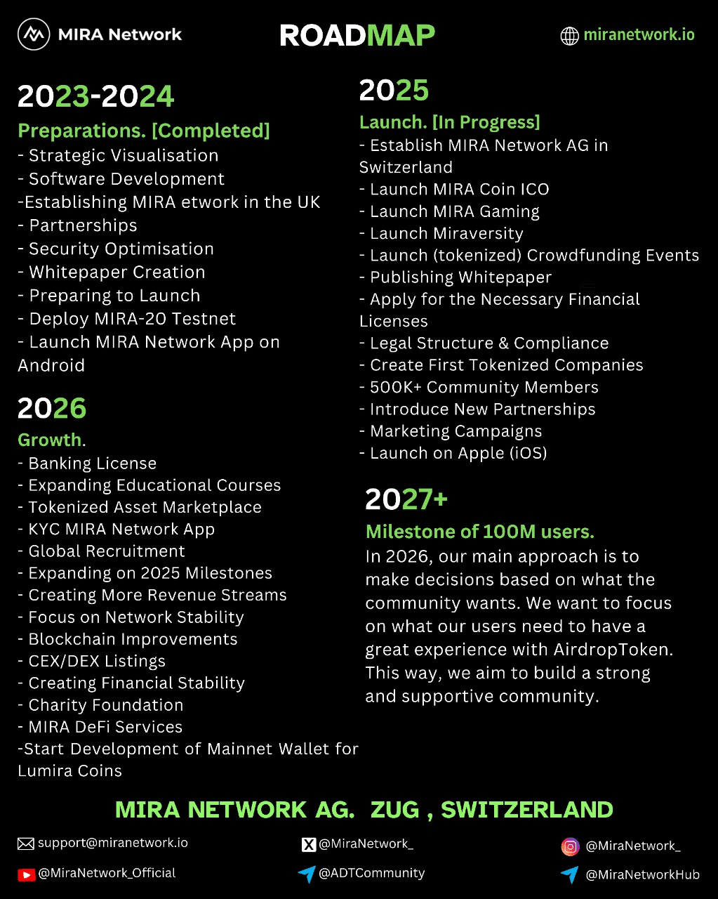 La roadmap di Mira Network AG rappresenta un approccio stratificato e strategico all'innovazione Web3. Integrando finanza decentralizzata, asset del mondo reale tokenizzati, crowdfunding conforme e un ecosistema educativo, Mira pone le basi per una piattaforma blockchain versatile e guidata dalla comunità. Il suo focus sulla crescita modulare, sull'accessibilità cross-platform e sulla previsione normativa la posiziona come un attore chiave all'interno del panorama infrastrutturale decentralizzato più ampio