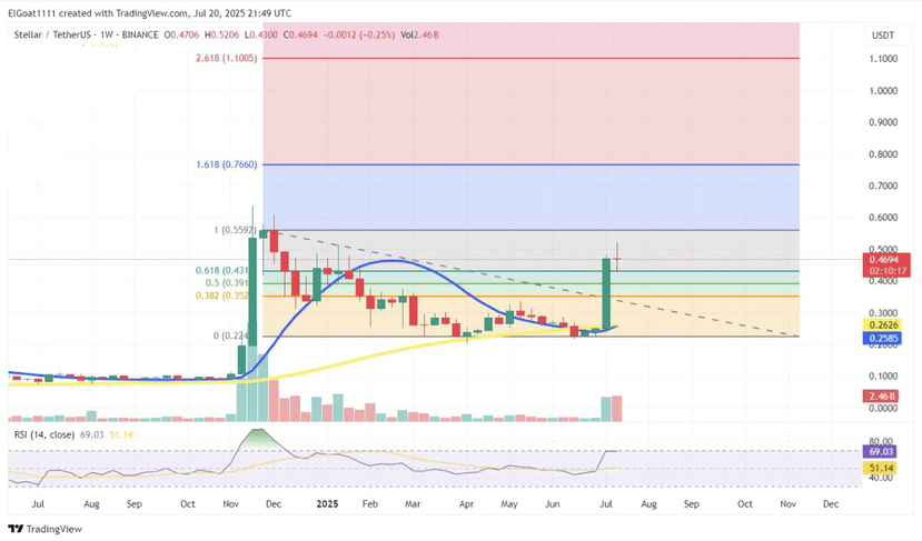 Gli indicatori tecnici supportano un’ottica rialzista. Sul grafico giornaliero, XLM sta testando la sua media mobile a 200 giorni, un livello chiave per confermare il slancio rialzista a lungo termine. L'Indice di Forza Relativa (RSI) è in tendenza rialzista ma rimane sotto i livelli di ipercomprato, indicando spazio per ulteriori guadagni. Un breakout sopra la zona di resistenza $0.15–$0.18 potrebbe spingere XLM verso $0.56, che si allinea con l'estensione di Fibonacci 1.618 dal suo recente minimo a massimo. Se il slancio porta XLM oltre $0.56, il prossimo obiettivo principale a $0.76 corrisponde al livello di Fibonacci 2.618 e alla resistenza storica del 2021.