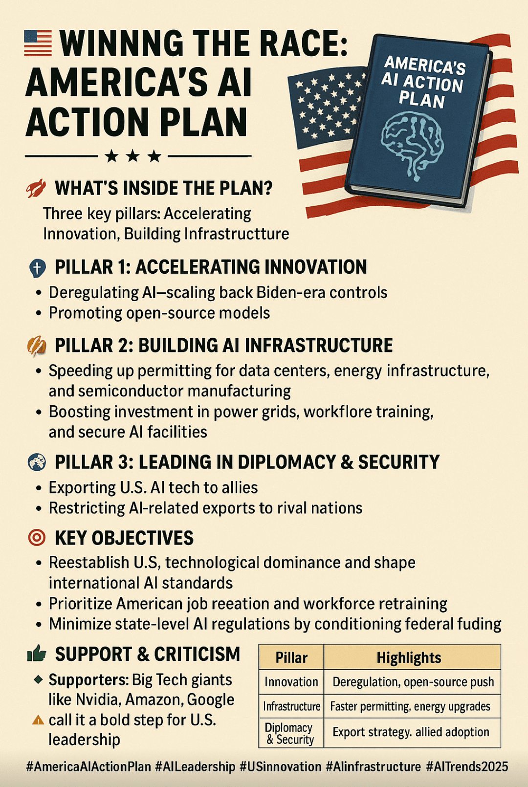Svelato a luglio 2025 come il piano di 28 pagine intitolato “Vincere la Corsa: Il Piano di Azione AI in America”, la strategia delinea oltre 90 politiche federali suddivise in tre pilastri chiave: Accelerare l'Innovazione, Costruire l'Infrastruttura e Guidare Globalmente nella diplomazia e sicurezza AI.