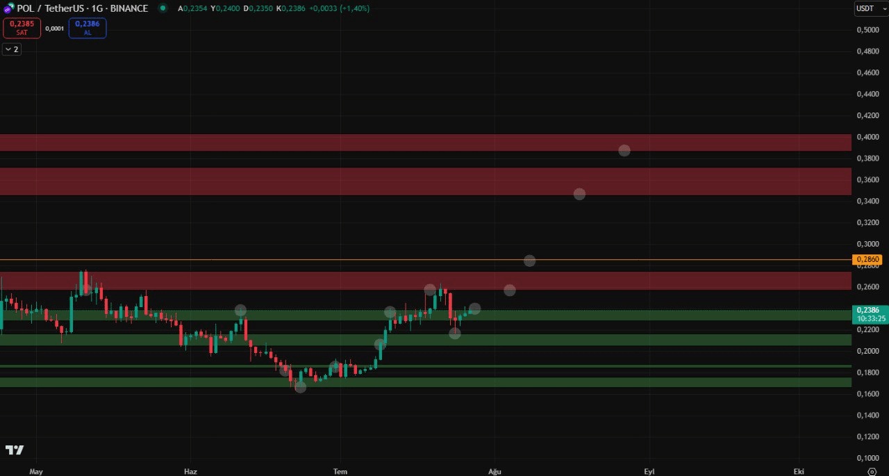 Dopo il test di una zona di resistenza, la scorsa settimana, $POL ha subito una leggera correzione, che è in linea con una situazione di mercato in indebolimento. Tuttavia, questo calo è stato controllato e mantenuto a livelli precedentemente definiti. Questa azione rafforza il modello tecnico di questo asset, poiché i contributori menzionano che un breakout sopra l'area arancione è possibile in caso di miglioramento del sentiment. È possibile qui cercare formazioni di prezzo più elevate.