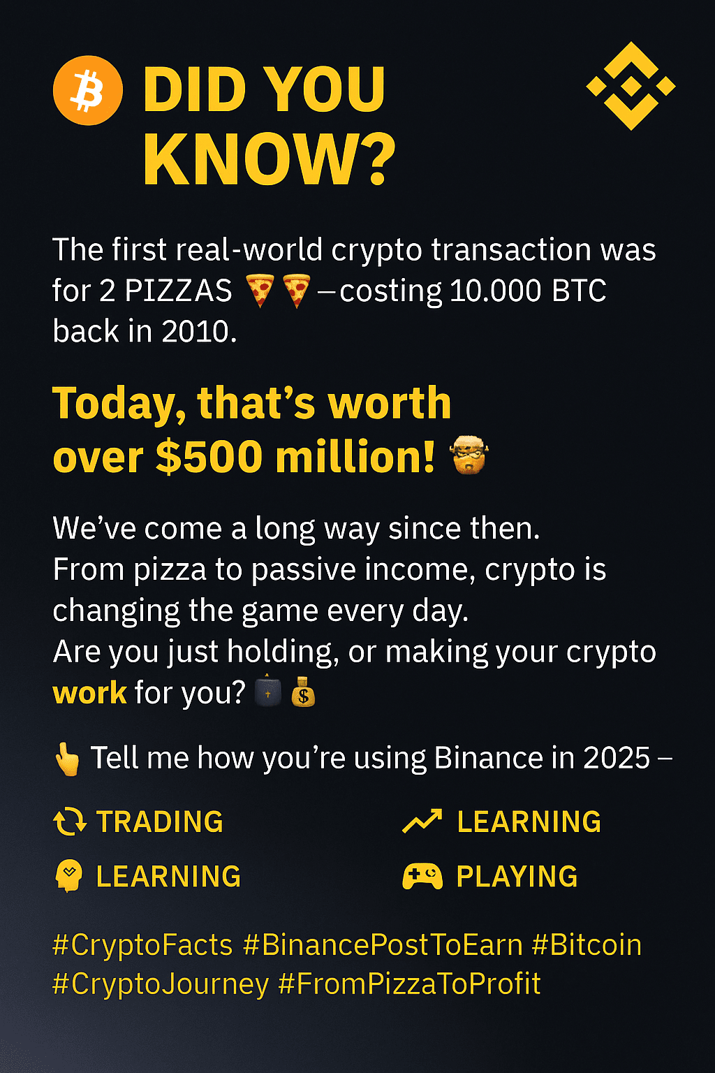 #CryptoFacts #BinancePostToEarn #Bitcoin #CryptoJourney #CryptoFacts #BinancePostToEarn #Bitcoin #CryptoJourney #FromPizzaToProfit