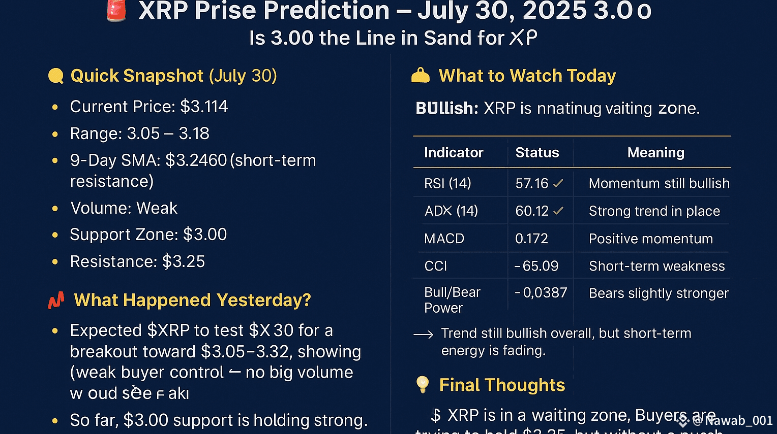 Dopo un forte rialzo all'inizio di questo mese, $XRP ora si sta muovendo lateralmente. Il prezzo è sceso dal suo recente massimo di $3.70 e attualmente si mantiene intorno a $3.11 — ma per quanto tempo?