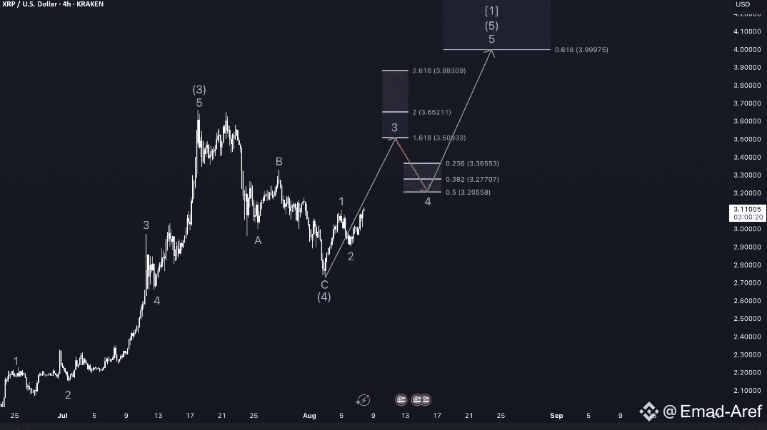 XRP si muove attualmente all'interno dell'onda minore 3, che è parte dell'onda intermedia 5, che a sua volta completa l'onda principale 1. Questa conformità attraverso più gradi di direzione suggerisce che la valuta potrebbe entrare in una fase dinamica di crescita, specialmente se mantiene la struttura dell'onda attuale senza rompere il fondo dell'onda 4.
