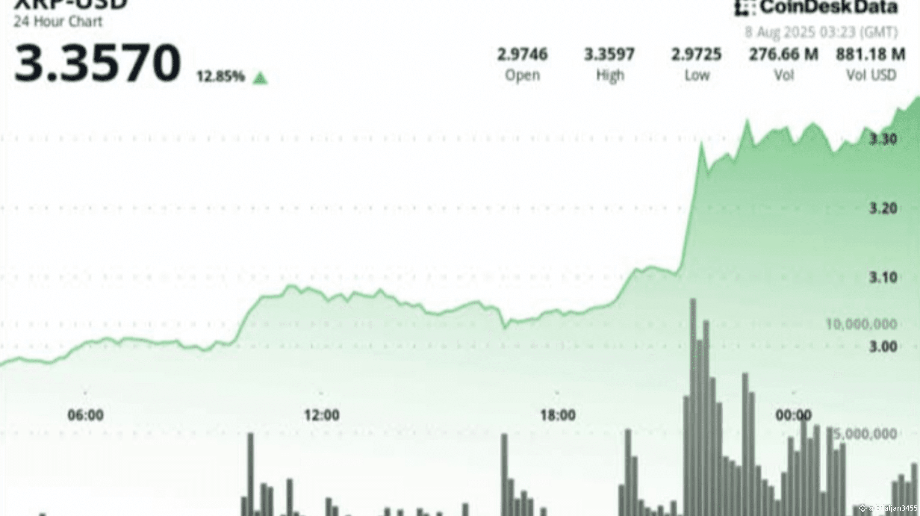 Secondo l'analisi tecnica, il prezzo di XRP è aumentato dell'11% l'8 agosto, passando da $2,99 a $3,30, e un volume superiore a 300 milioni è stato registrato, con una volatilità del mercato del 12%, e un nuovo livello di resistenza stabilito a $3,33.