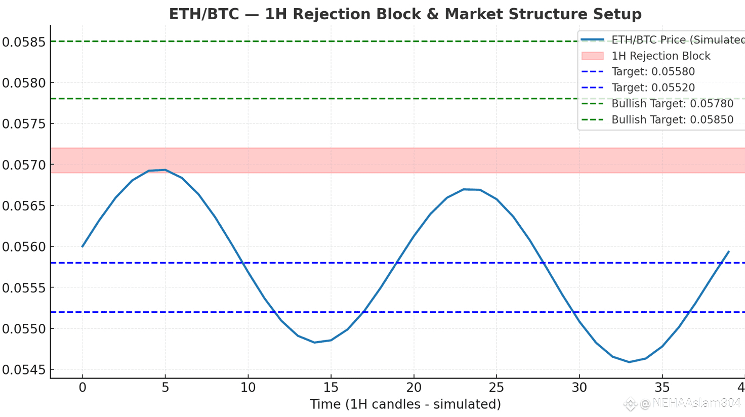⚡ In breve: ETH/BTC è in una zona di decisione. Il rifiuto mantiene il 1H ribassista, il recupero ribalta il bias rialzista.