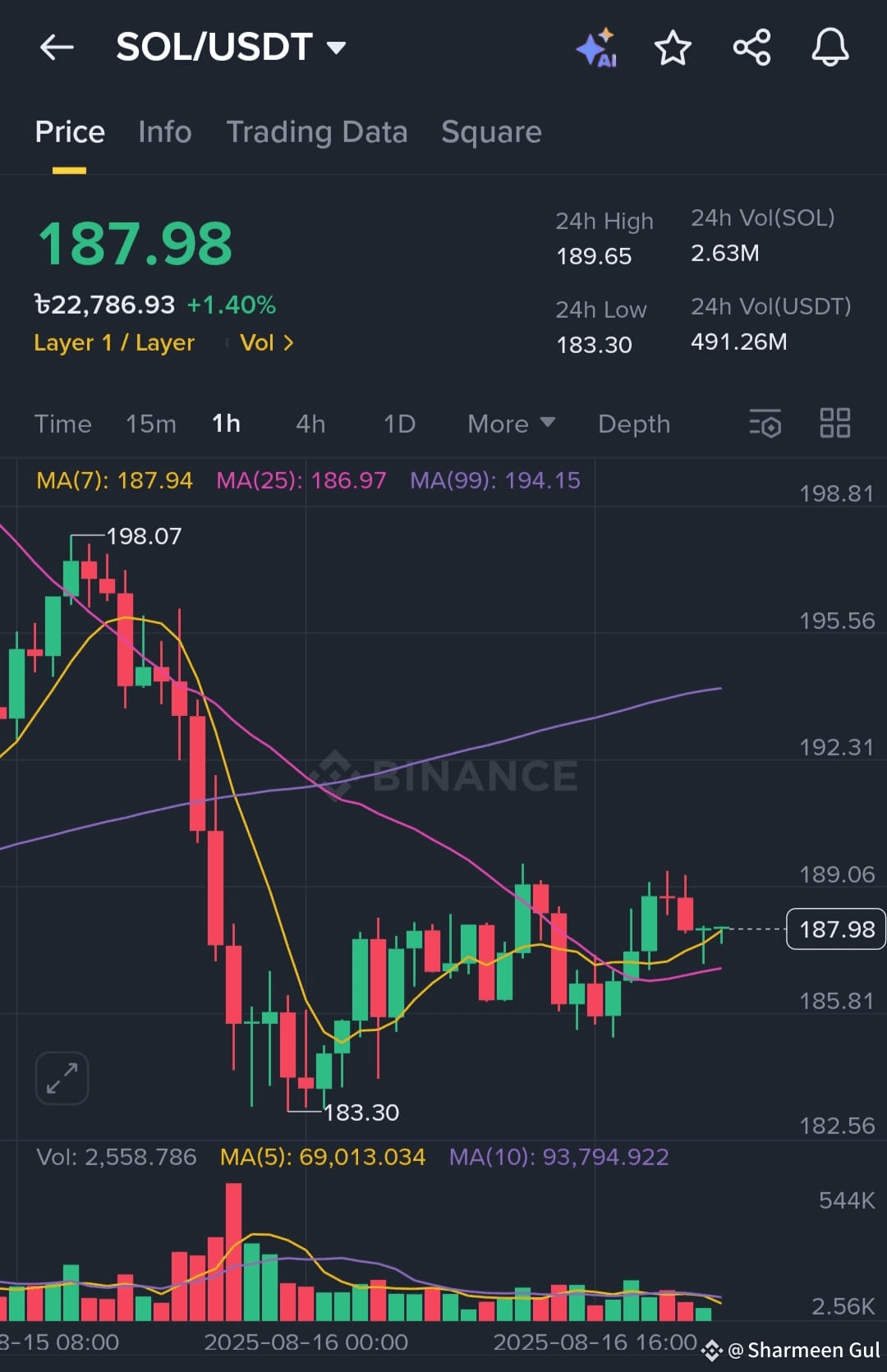 Il prezzo di Solana (SOL) è attualmente di $187,98, mostrando un piccolo aumento dell'1,40% nelle ultime 24 ore. Guardando il grafico, il prezzo è stato piuttosto volatile. Ha raggiunto un massimo di $198,07 e poi ha subito un calo significativo a un minimo di $183,30.