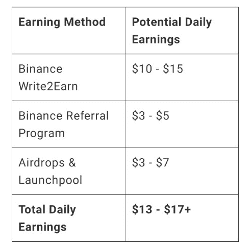 Se vuoi guadagnare $13 - $17 al giorno su Binance senza investire i tuoi soldi, devi concentrarti su metodi di guadagno senza rischio. Binance offre diverse opportunità per guadagnare attraverso scrittura, referral, airdrop e strategie di trading senza bisogno di capitale.