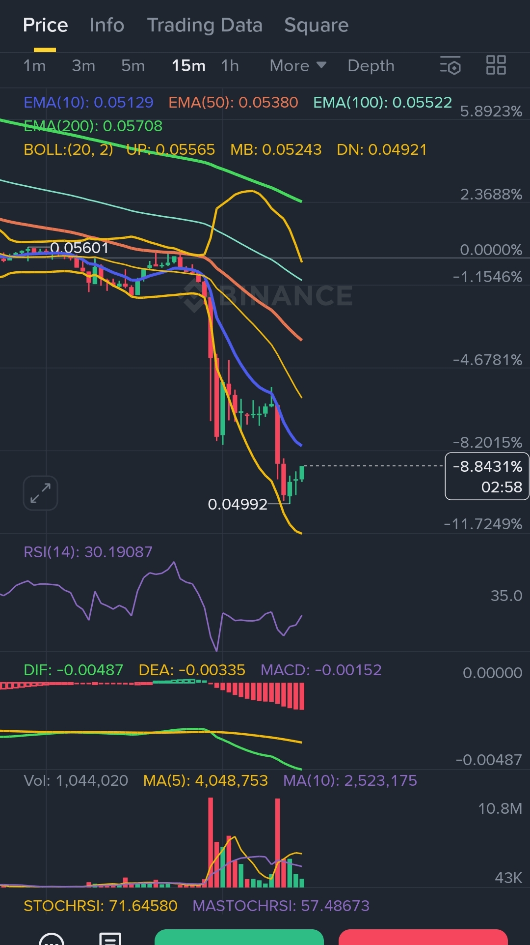 - **Rottura di Supporto Maggiore:** Il prezzo ha **TAGLIATO VIOLENTEMENTE** la Banda di Bollinger inferiore ($0.05057) e il supporto psicologico chiave a $0.0500. Questo non è un test; è una rottura confermata.