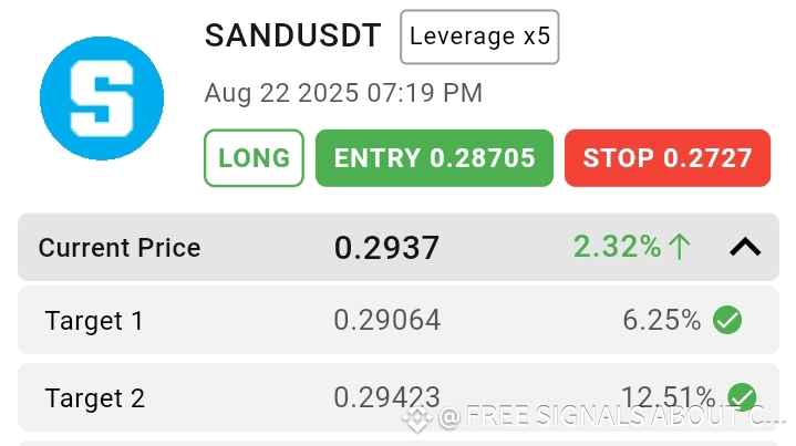 Il segnale di sand è molto forte, si sta mostrando un momentum rialzista! Il punto di ingresso era 0.28705 e ora il prezzo è salito a 0.2937, ovvero un aumento del 2.32%. I primi 3 obiettivi sono stati raggiunti ✅, e ora ci sono i prossimi obiettivi principali a 0.31576 (50%) e 0.33011 (75%). Lo stop loss è a 0.2727, il che rende il rapporto rischio-rendimento molto buono. 🚀