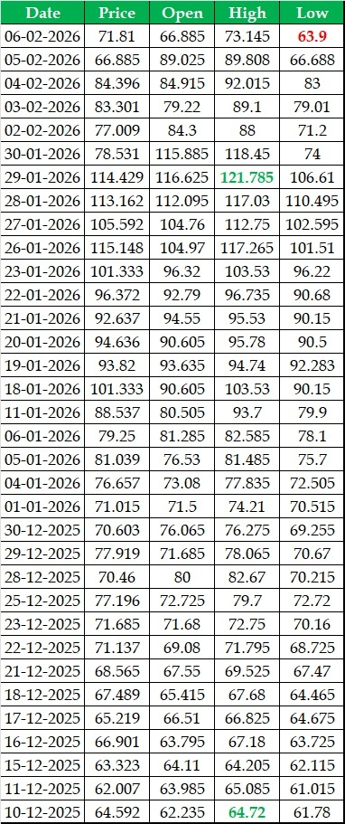 L'argento ha vissuto fluttuazioni significative recentemente, passando da 64 USD a 121,87 USD in soli 28 giorni di negoziazione, quasi raddoppiando in 50 giorni. Tuttavia, è poi sceso a 63,9 USD in soli 7 giorni di negoziazione, mostrando la sua volatilità.