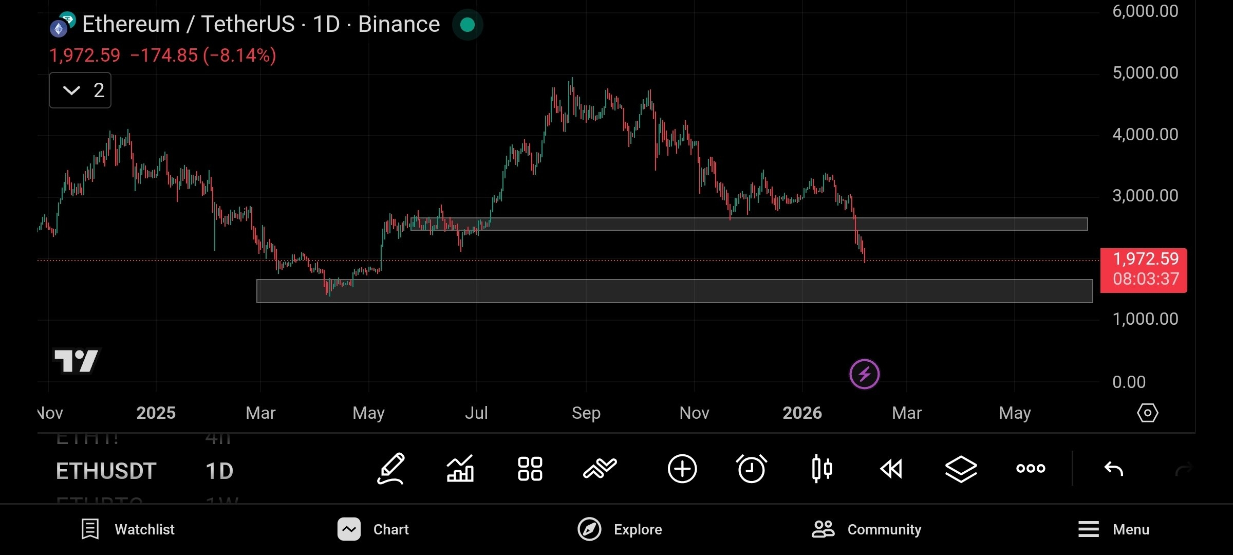 Se questa tendenza non si inverte con un recupero a forma di V, #Ethereum continuerà probabilmente a scendere verso l'area di supporto inferiore 1.6k - 1.5k