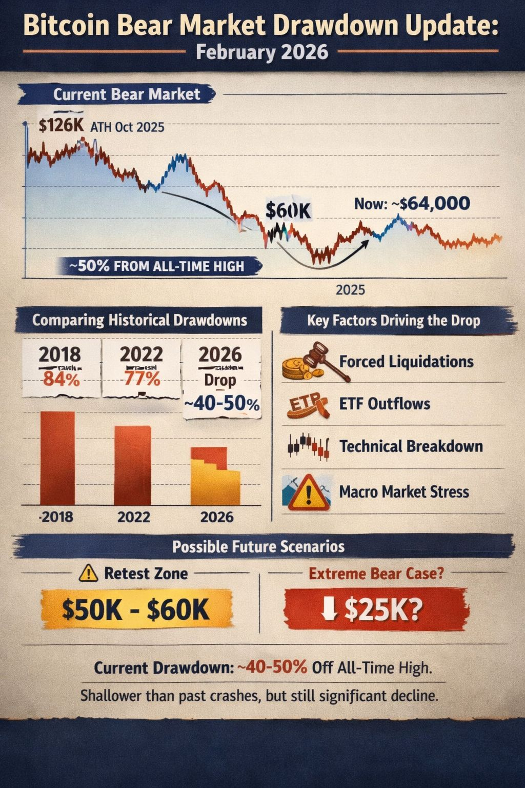 $BTC Il Bitcoin ha recentemente perso circa il 50% del suo valore rispetto al massimo storico (~$126.000 nell'ottobre 2025), con i prezzi scesi sotto $64.000 e brevemente vicino a $60.000 prima di un breve rimbalzo.
