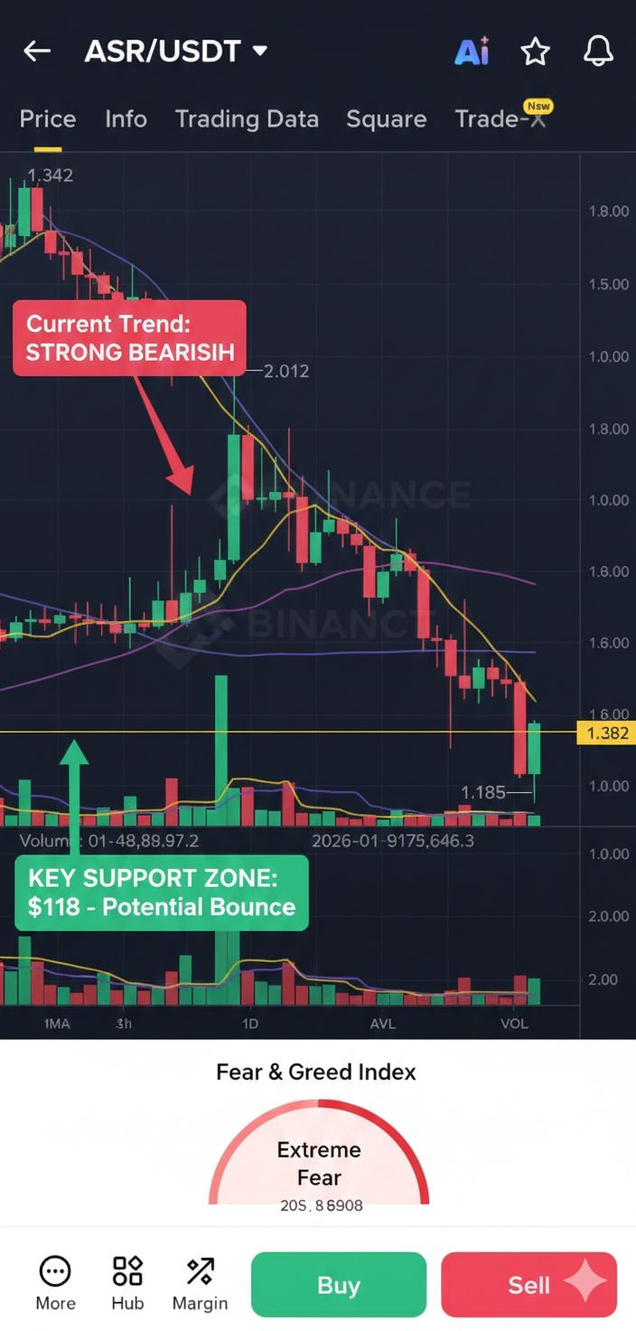 ASR sta attualmente oscillando attorno a $1.34. Esiste una zona di supporto importante vicino a $1.185, che storicamente ha agito come un forte pavimento — le azioni di prezzo precedenti hanno mostrato rimbalzi da quest'area. Questo livello sarà critico nelle prossime sessioni.