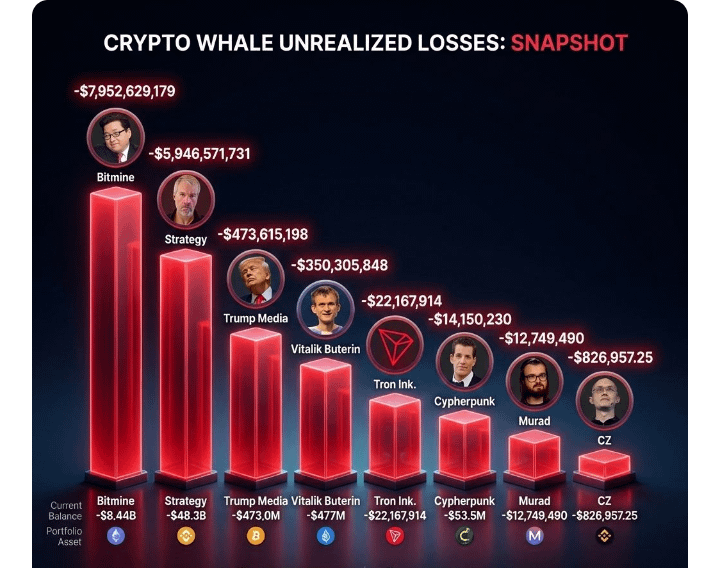El gráfico de pérdidas no realizadas de las ballenas de criptomonedas es brutal a primera vista: barras rojas, pérdidas de nueve cifras y algunos de los nombres más grandes del ecosistema crypto profundamente bajo el agua. Pero si miras más de cerca, estos números no gritan colapso. Más bien, muestran convicción a gran escala.