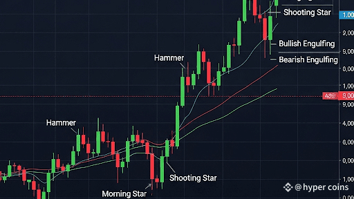 Stella del Mattino: Un modello a tre candele che appare dopo una tendenza al ribasso. La prima candela è una lunga candela ribassista, la seconda è una candela a corpo piccolo (un doji o un top rotante), e la terza è una lunga candela rialzista. Questo modello indica un cambiamento da un sentimento ribassista a uno rialzista.