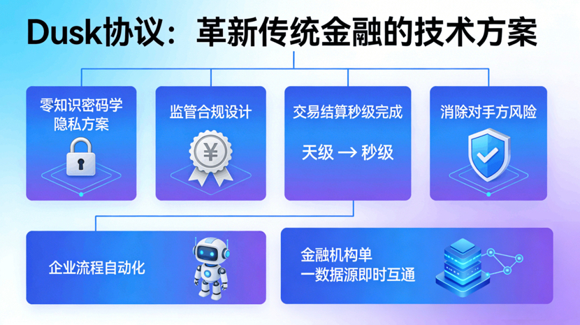Dusk的长处藏在对金融本质的深刻理解里,它精准踩中了传统金融的痛点,用零知识密码学打造的企业级隐私方案,搭配全维度的监管合规设计,解决了机构上链的最大顾虑——隐私与合规的矛盾。当其他公链还在追求高TPS时,Dusk把精力放在了金融机构真正需要的地方:交易结算从天级压缩到秒级,剔除交易清算中的对手方风险大幅降本,企业行为的复杂流程实现自动化,不同金融机构间靠单一真实数据源实现即时互通。