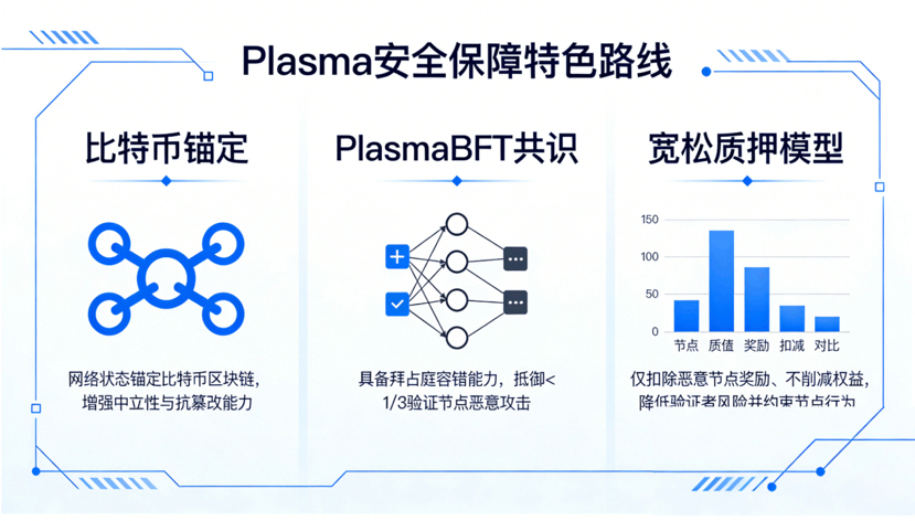 安全保障上,Plasma走出“比特币锚定+奖励削减”特色路线。它将网络状态锚定比特币区块链,借助其强大去中心化安全体系增强自身中立性与抗篡改能力;PlasmaBFT共识本身具备拜占庭容错能力,可抵御不到1/3验证节点恶意攻击。此外宽松质押模型仅扣除恶意节点奖励、不削减权益,既降低验证者风险,也通过经济激励约束节点行为。