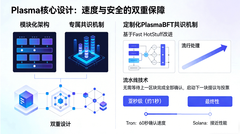 Plasma兼顾速度与安全的核心,在于“模块化架构+专属共识机制”的双重设计。速度优化上,它采用定制化PlasmaBFT共识机制,基于Fast HotStuff改进,通过“流水线”技术让共识过程并行推进,无需等待上一区块完成全部确认,就能启动下一块提议与投票,实现亚秒级(约1秒)最终性,远超Tron的60秒确认速度,接近Solana性能。