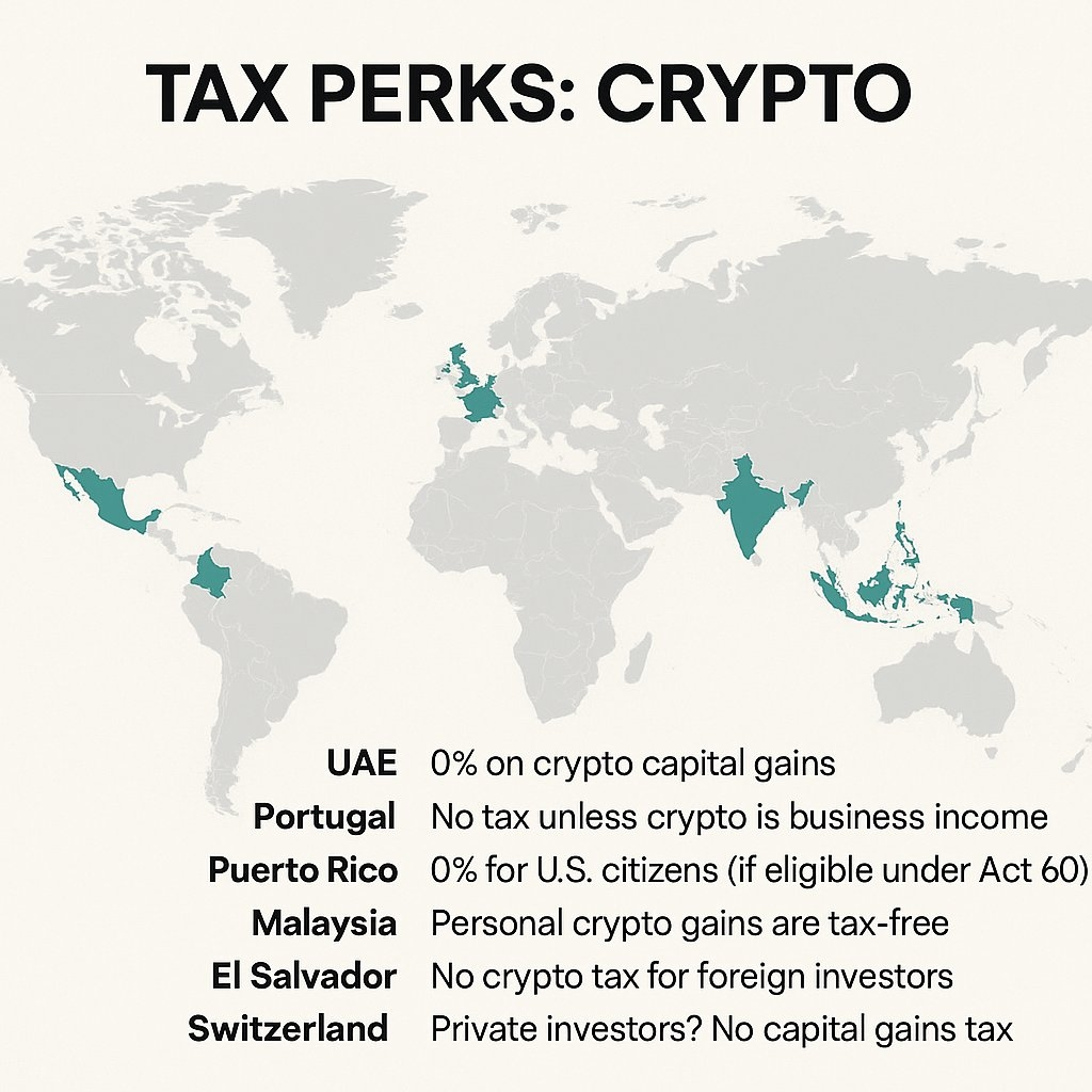 Per grandi portafogli, le tasse drenano il capitale più efficientemente di qualsiasi mercato ribassista. Gli investitori seri pensano in termini di giurisdizione, residenza e struttura legale. Diversi paesi offrono legalmente tassazione zero o quasi zero sui guadagni personali in criptovalute, tra cui gli Emirati Arabi Uniti, il Portogallo per attività non commerciali, Porto Rico per cittadini statunitensi idonei, Malesia, El Salvador per investitori stranieri e Svizzera per investitori privati. La ricchezza senza pianificazione fiscale è una ricchezza temporanea.