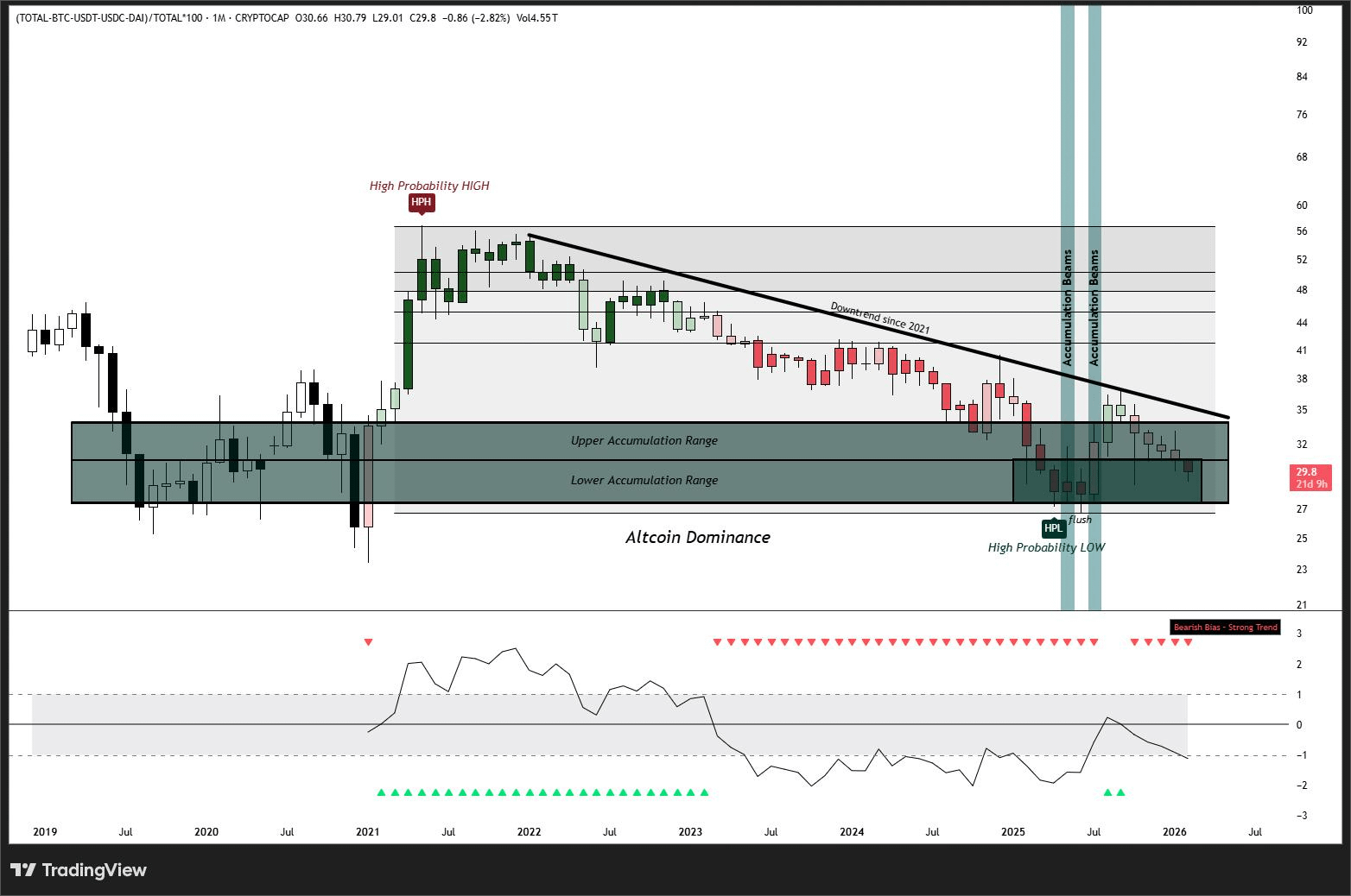 Ad aprile dell'anno scorso, dopo un periodo di liquidazione a causa dei dazi, ho ricevuto HPL (High Probability Low) sul timeframe mensile, dopo che gli altcoin hanno fallito nel breakout per tutto il ciclo.