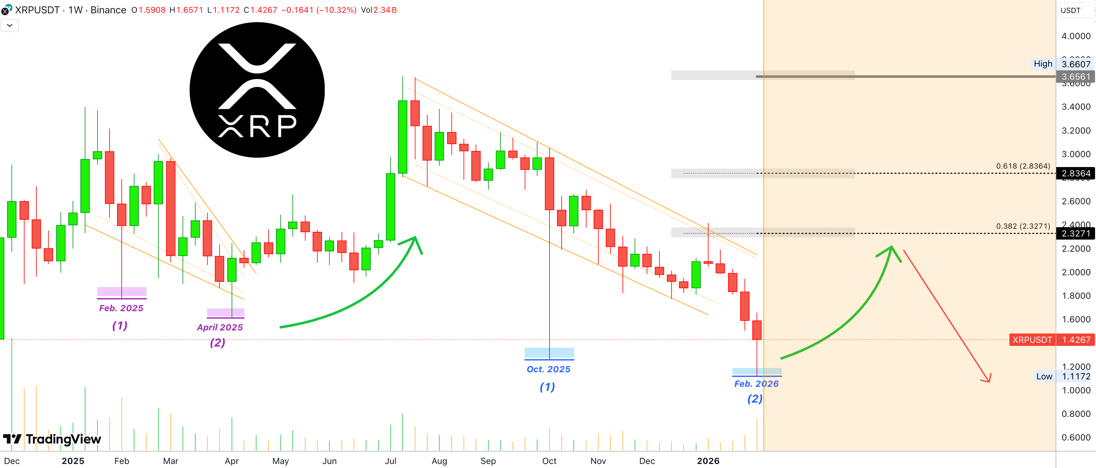Come puoi vedere, $XRP USDT è impostato per chiudere cinque settimane consecutive in rosso, con l'attuale settimana che ha un lungo ombra inferiore. Questo chiama un po' di sollievo.
