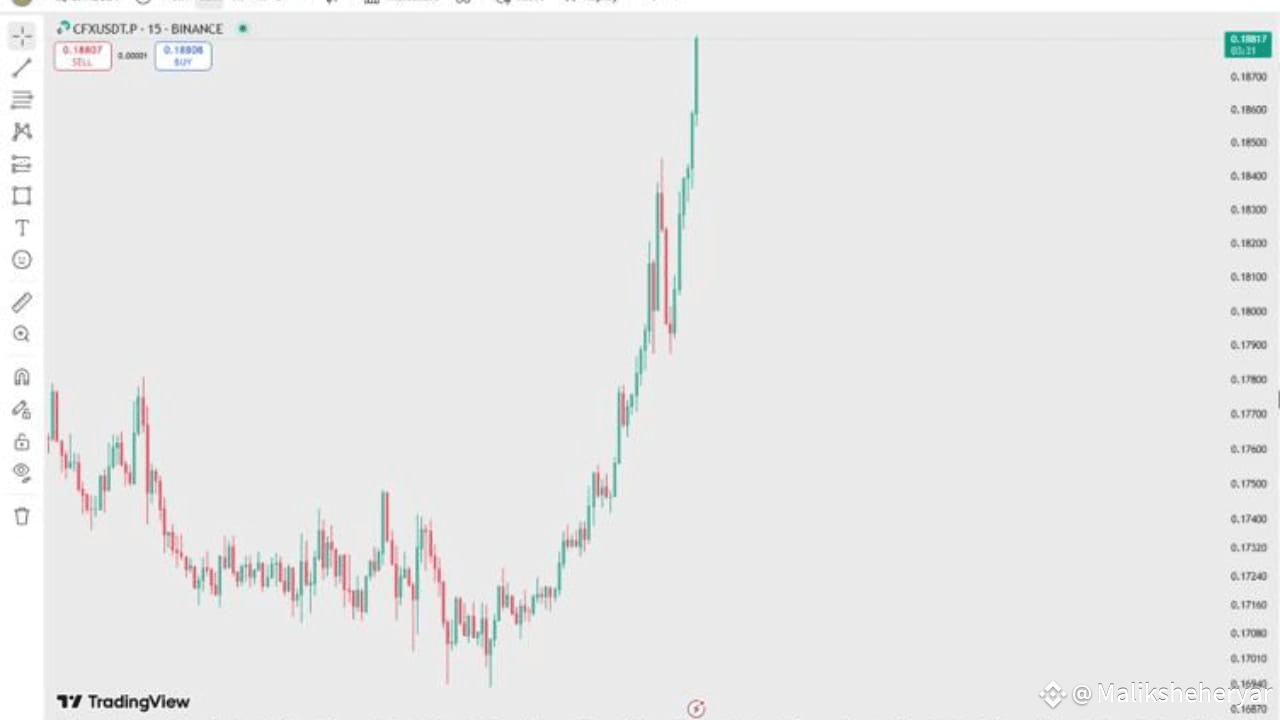 Dopo un periodo di consolidamento, Conflux ($CFX) sembra stia guadagnando slancio rialzista. Recenti analisi del grafico, in particolare su orizzonti temporali più brevi, mostrano un breakout con forti candele verdi e un notevole aumento del volume degli acquisti.