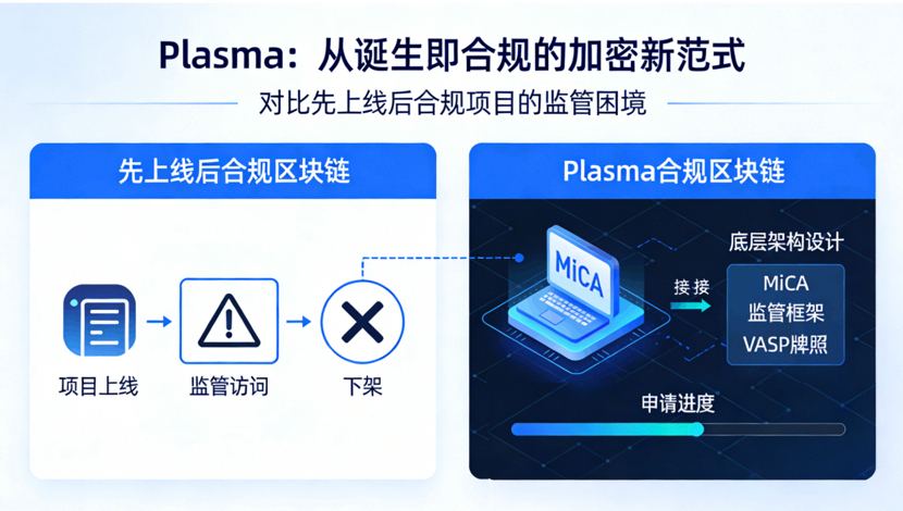 Plasma它不玩虚的,从诞生就把合规当核心,而非后期补漏。很多区块链先上线后合规,最后被监管约谈、下架,但Plasma从底层架构就围绕合规设计,主动对接MiCA等全球主流监管框架,还在积极申请VASP牌照,这种主动拥抱监管的态度,在加密圈太难得。
