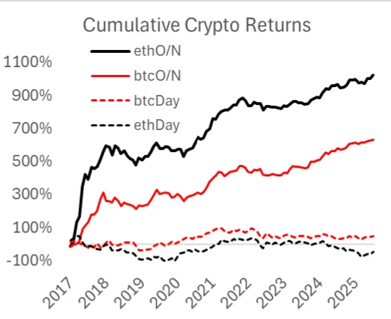 I rendimenti notturni nelle criptovalute si riferiscono ai movimenti dei prezzi che si verificano quando i mercati azionari statunitensi sono chiusi (dalle 16:00 alle 9:30 EST). A differenza dei mercati tradizionali che chiudono, i mercati delle criptovalute operano 24 ore su 24, 7 giorni su 7, rendendo questa analisi particolarmente interessante