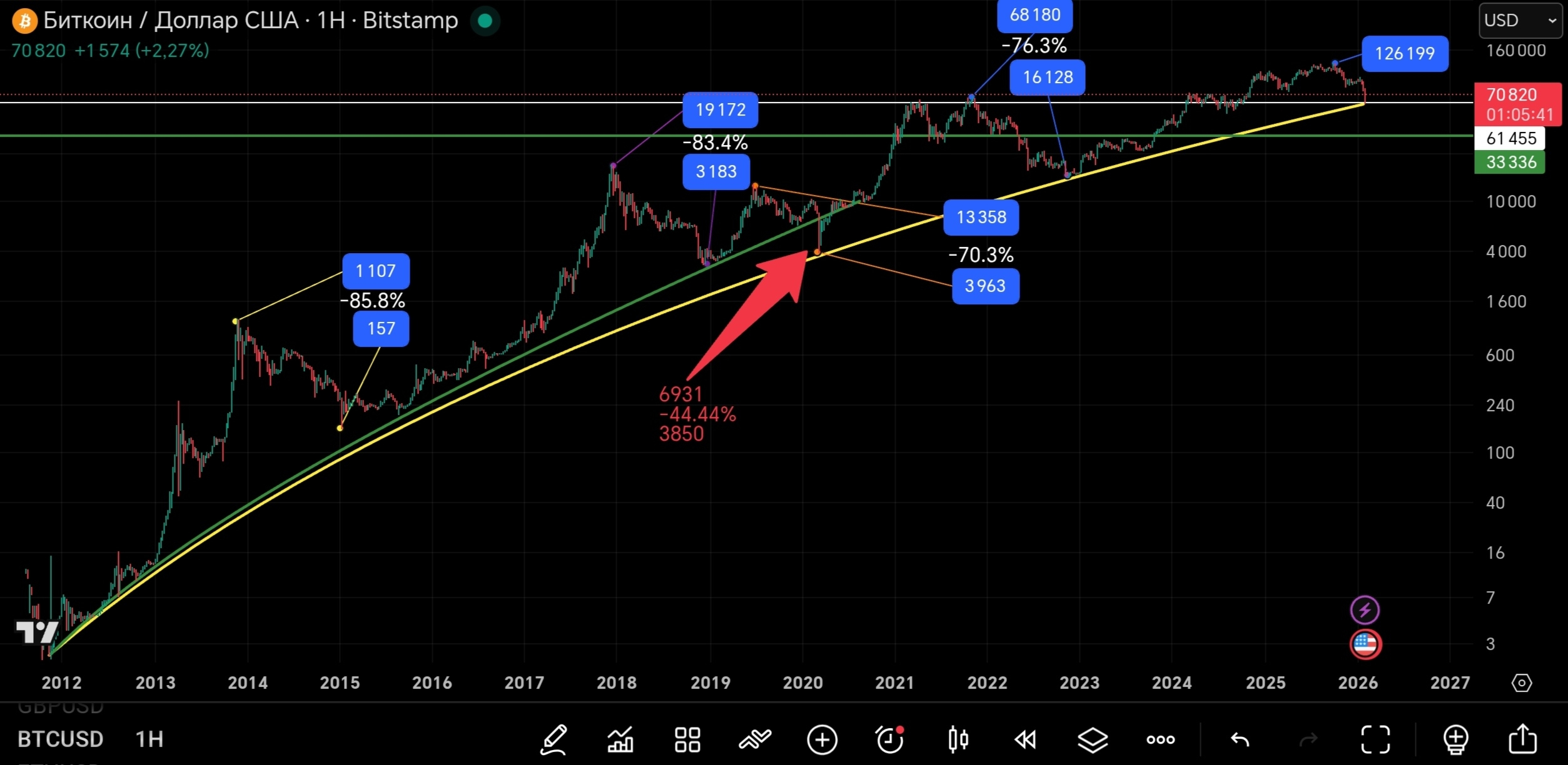 Я всегда ищу закономерности и можно рассмотреть возможный сценарий на примере ситуации которая случилась ранее (с 6931 до 3850 на 44.44%). Снижение с 60 000 на 44.44% что составит 33 336, конечно печально, но не так сильно если смотреть на снижения по циклам.