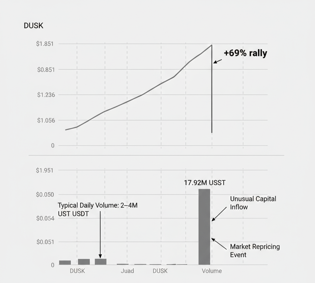 I've watched enough altcoin pumps to recognize the difference between dead cat bounces and rallies driven by actual information. Random 20-30% pumps happen all the time in illiquid markets—bots, shorts covering, whales playing around. But 69% rallies on 17.92 million USDT volume during a year when a project is supposed to launch institutional partnerships don't happen randomly. Either someone knows something about DuskTrade that isn't public yet, or this is the most aggressive bull trap I've seen in crypto.