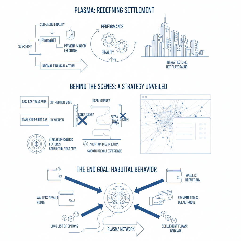 Ciò che rende questo progetto distintivo è come il piano "dietro le quinte" sia effettivamente visibile se lo leggi come una strategia invece che come un elenco di funzionalità, perché i trasferimenti senza gas non sono solo una funzionalità di convenienza, sono una mossa di distribuzione, e il gas per le stablecoin non è solo un dettaglio tecnico, è un'arma UX, dato che rimuove il momento in cui un utente si imbatte in un ostacolo e si rende conto di aver bisogno di un altro token, un altro scambio, un altro passaggio, e nei pagamenti, i passaggi extra sono dove l'adozione muore silenziosamente, quindi Plasma sta cercando di rendere l'esperienza predefinita così fluida che diventa abituale, e una volta che il comportamento diventa abituale, è allora che portafogli, strumenti di pagamento e flussi di regolamento iniziano a trattare una rete come un percorso predefinito invece di un'altra opzione su un lungo elenco.