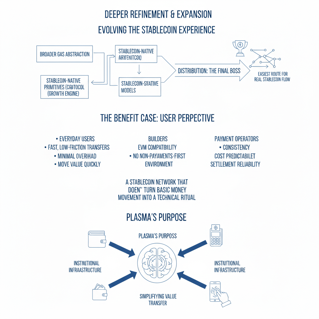 Cosa viene dopo, se Plasma rimane fedele al suo scopo, dovrebbe sembrare meno un'espansione casuale e più come un affinamento più profondo dell'esperienza delle stablecoin, dove l'astrazione del gas diventa più ampia e più fluida, dove i modelli di sponsorizzazione diventano più sicuri e più ampiamente integrati, dove i primitivi nativi delle stablecoin sono trattati come comportamenti core del protocollo piuttosto che come aggiunte opzionali, e dove le integrazioni negli strumenti di tipo pagamento diventano il vero motore di crescita, perché la distribuzione è il boss finale per qualsiasi rete di regolamento, e i vincitori sono raramente quelli con le affermazioni più forti, sono quelli che finiscono per essere il percorso più facile per il vero flusso di stablecoin.