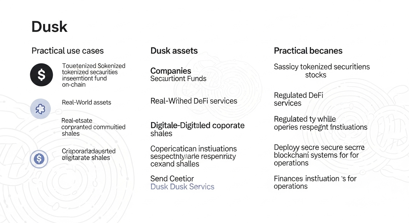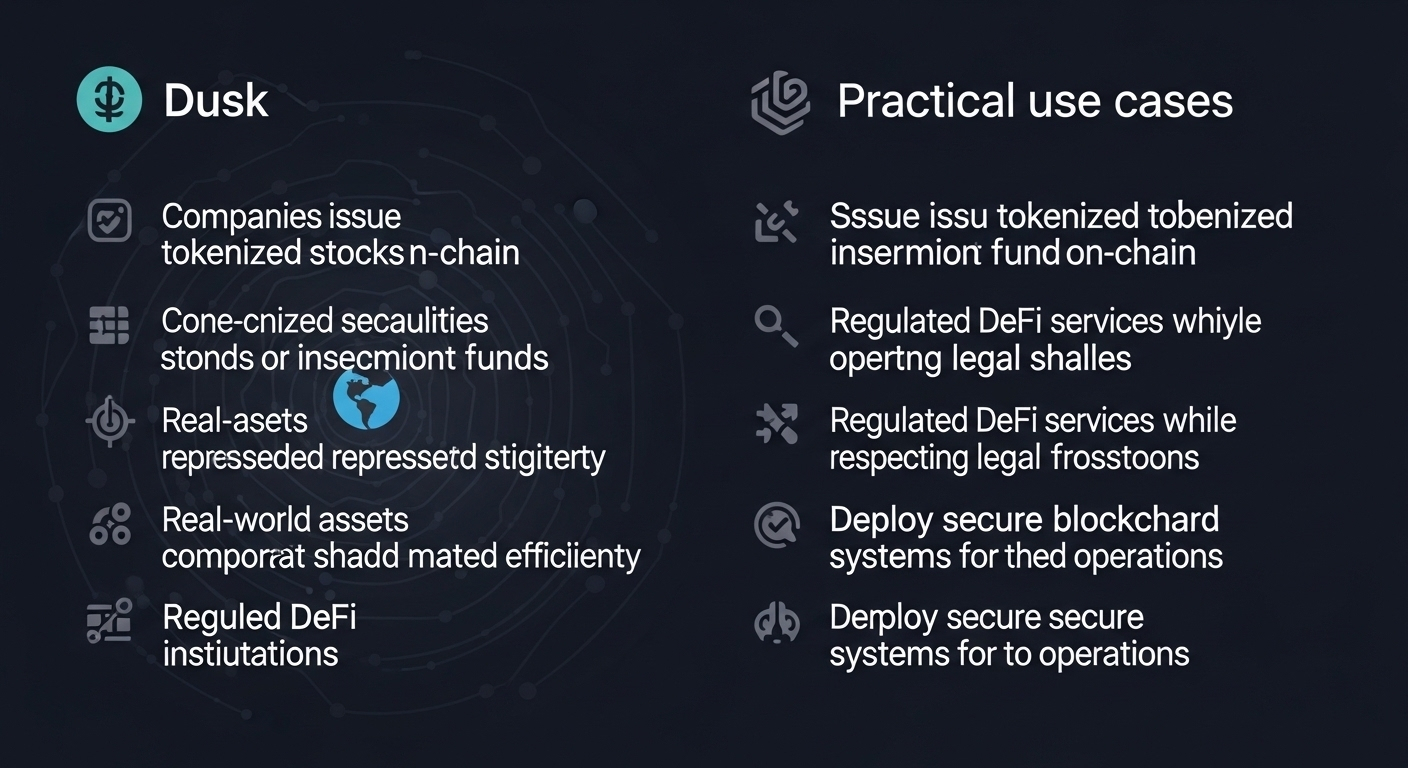 Dusk is particularly focused on practical financial use cases. Companies can issue tokenized securities such as stocks, bonds, or investment funds on-chain. Real-world assets like real estate, commodities, or corporate shares can be digitally represented and traded more efficiently. Regulated DeFi services can operate while respecting legal frameworks, and financial institutions can deploy secure blockchain-based systems for their operations. Instead of focusing on short-term trends, Dusk aims to support long-term financial infrastructure.