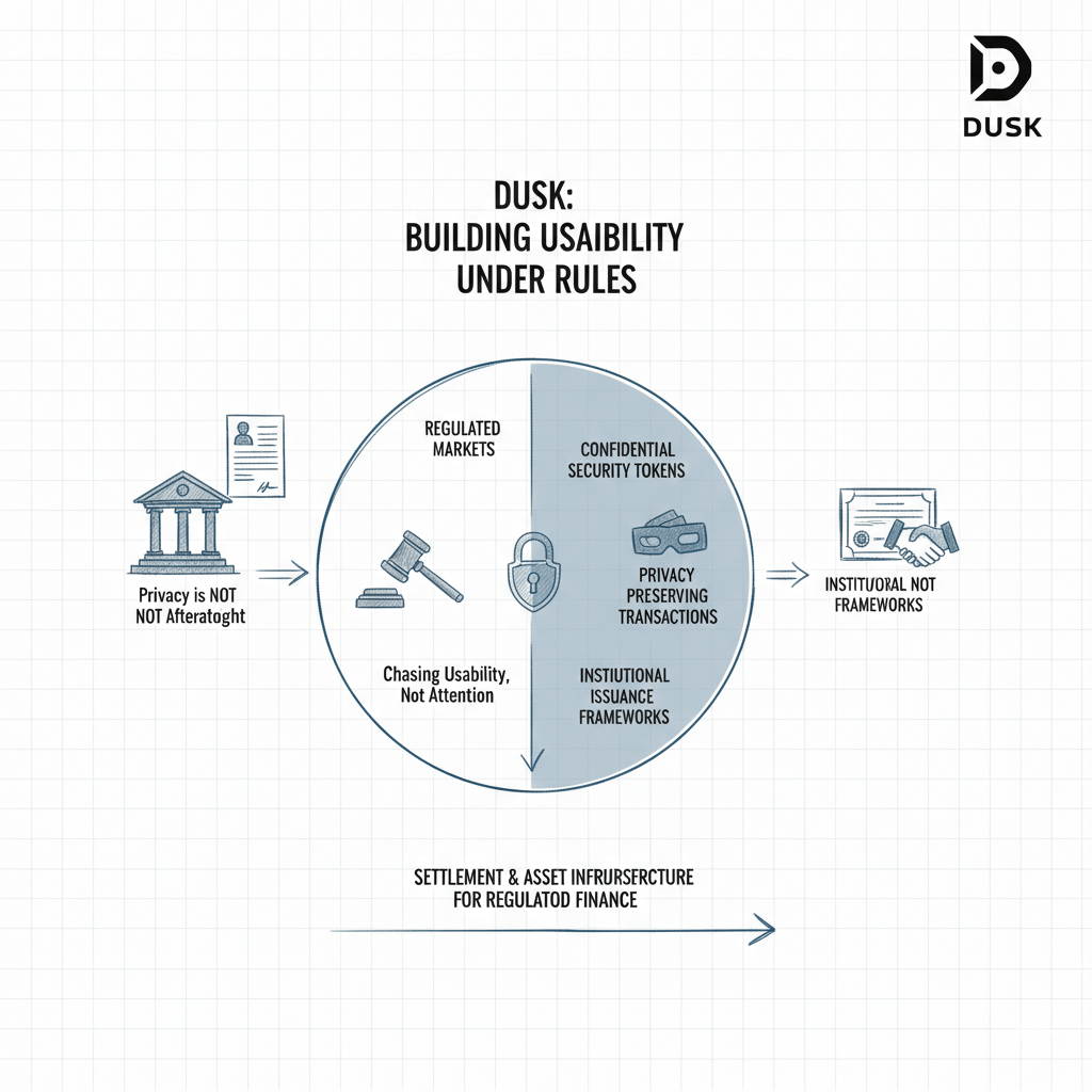 My takeaway is that Dusk is best understood as a disciplined attempt to build a settlement and asset infrastructure for regulated markets where privacy is not a slogan and compliance is not an afterthought, and if they keep pushing adoption around confidential security tokens, privacy preserving transactions, and issuance frameworks that real institutions can tolerate, the project has a clearer destination than most chains, because it is not chasing attention, it is chasing usability under rules.
