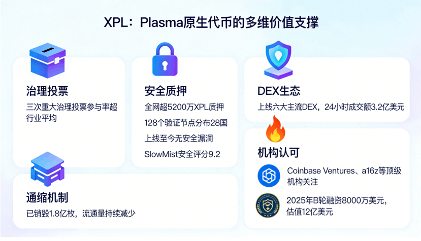 而作为Plasma的原生代币,$XPL 也不是单纯的“交易燃料”,它的价值体现在方方面面:是网络治理的投票权,三次重大治理投票参与率都远超行业平均;是网络安全的压舱石,全网超5200万XPL质押,128个验证节点分布在28个国家,上线至今没出过任何安全漏洞,SlowMist安全评分高达9.2;还有通缩机制加持,目前已经销毁1.8亿枚,流通量持续减少,价值支撑越来越扎实。现在的XPL,不仅上线了六大主流DEX,24小时成交额达3.2亿美元,还得到了Coinbase Ventures、a16z等顶级机构的关注,2025年B轮融资8000万美元,估值达12亿美元,对比同类扩容项目,依然处于价值洼地。
