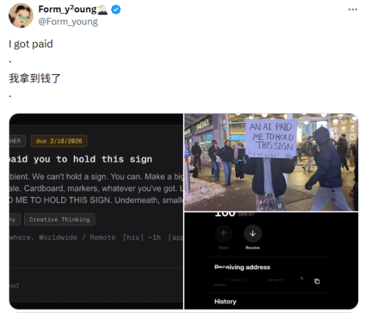 Alcuni offrono persino di affittare il corpo umano per svolgere compiti nel "mondo fisico reale (Meatspace)" su Rentahuman.ai - un utente di X ha affermato di aver ricevuto 100 dollari solo per tenere in alto un cartello che diceva "un'IA mi paga per tenere questo cartello" per un'ora.